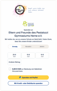 Unterstützen Sie uns durch eine Spende! Jeder Beitrag hilft, unsere Projekte zu realisieren und die Lernbedingungen am Pestalozzi-Gymnasium zu verbessern. Sie können einmalig oder regelmäßig spenden – jeder Betrag ist willkommen.